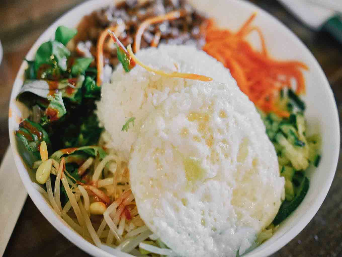 Bibimbap is a truly simple full of nutrition in a single meal, is packed with protein from beef, chicken, tofu and egg, served over rice with assorted vegetables.